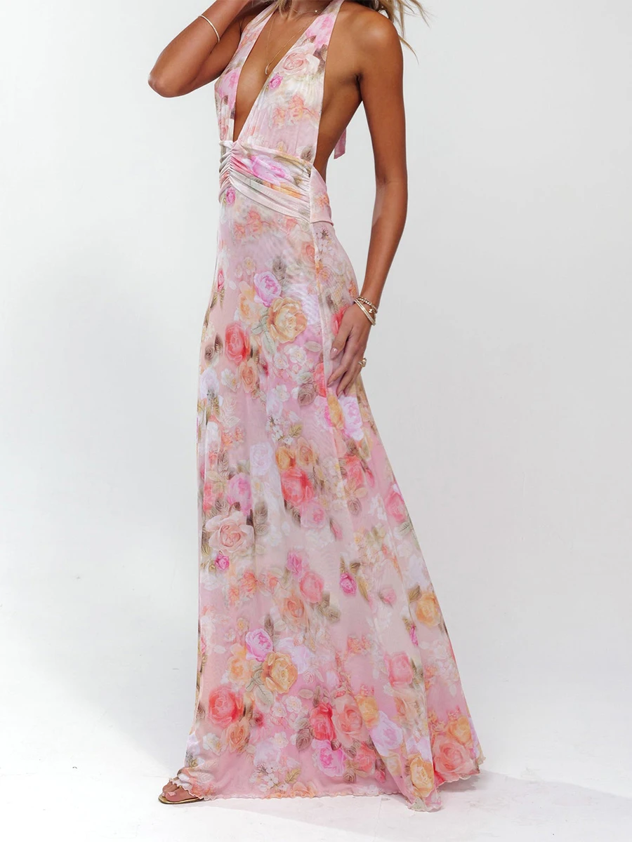 Women Long Dress, Sleeveless Halter Dress Backless Flower Print Summer Cocktail Dress