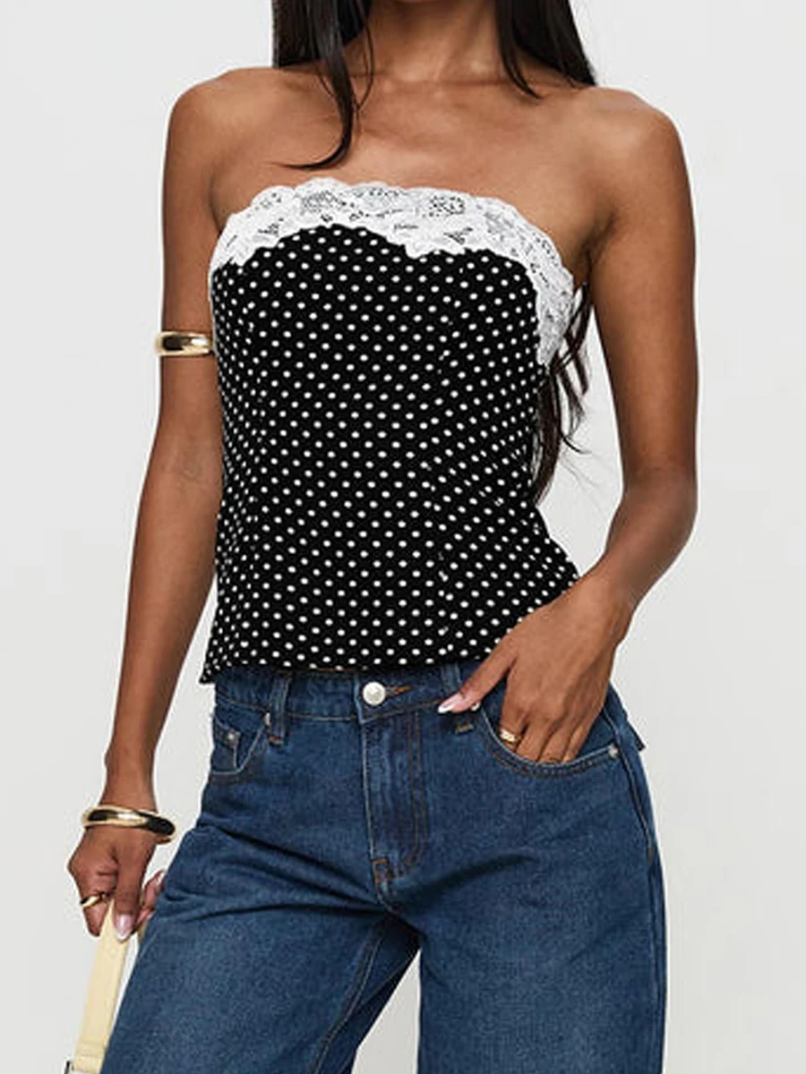 Women’s Lace Trim Tube Tops Sleeveless Strapless Zip Up Dots Print Fit Bandeau Tops Shirts