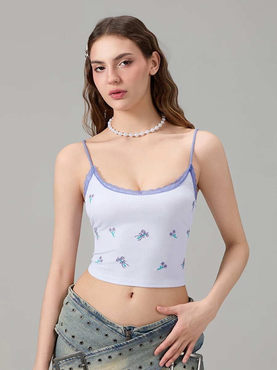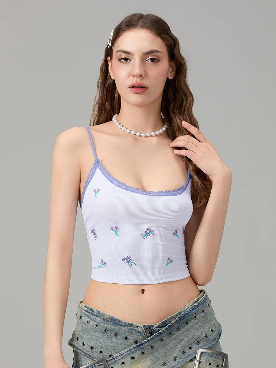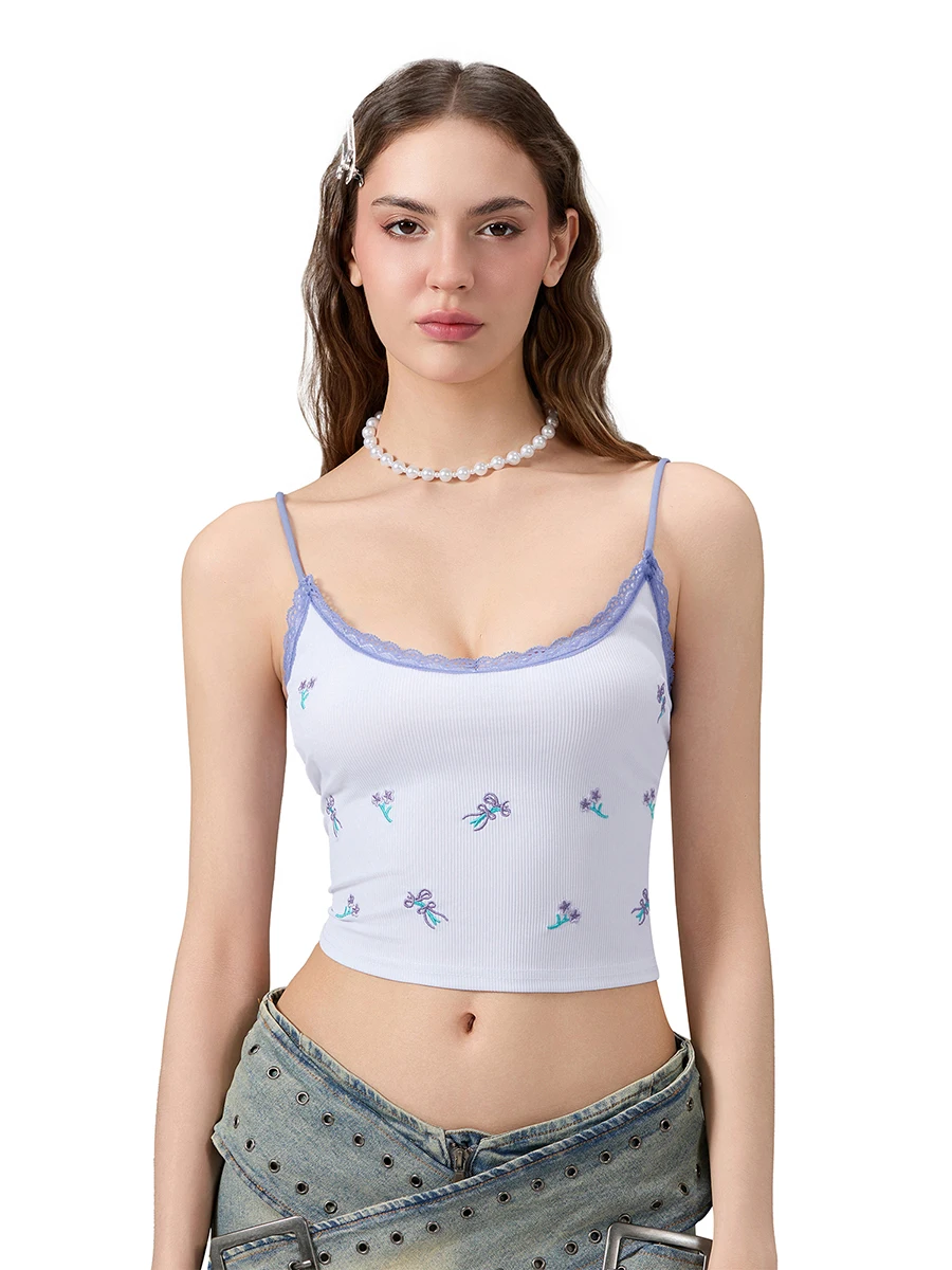 Women Crop Fitted Camisole Lace Trim Summer Spaghetti Strap Tank Tops Sleeveless T-Shirt for Streetwear Clubwear