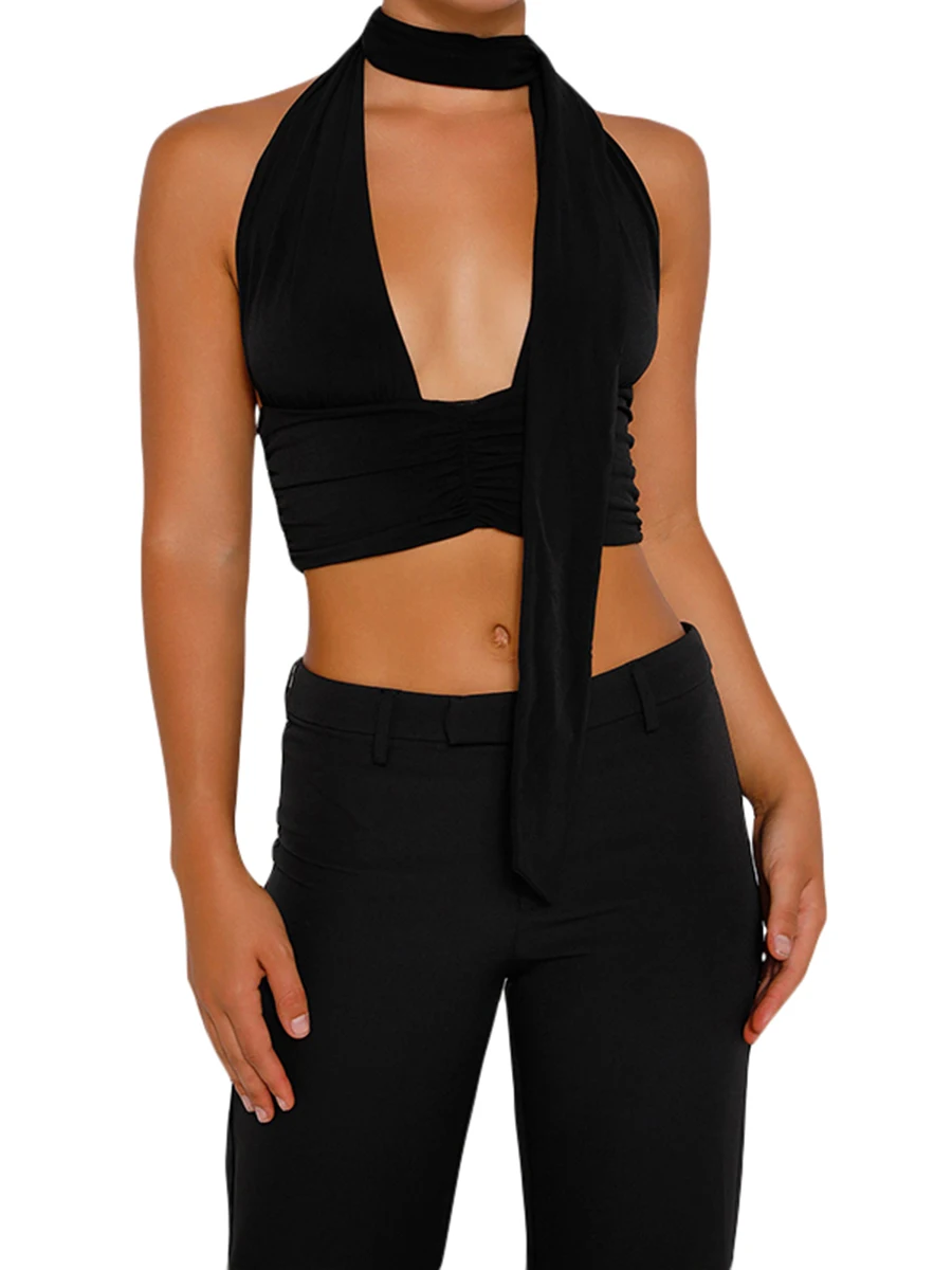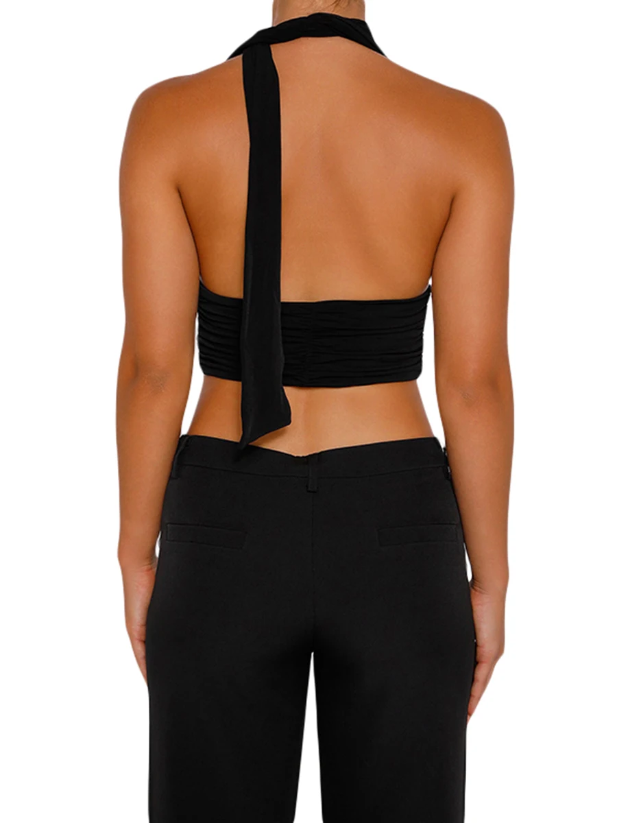 Women Ruched Halterneck Tops Solid Color Summer Casual Bandage Backless Sleeveless Crop Tops Streetwear