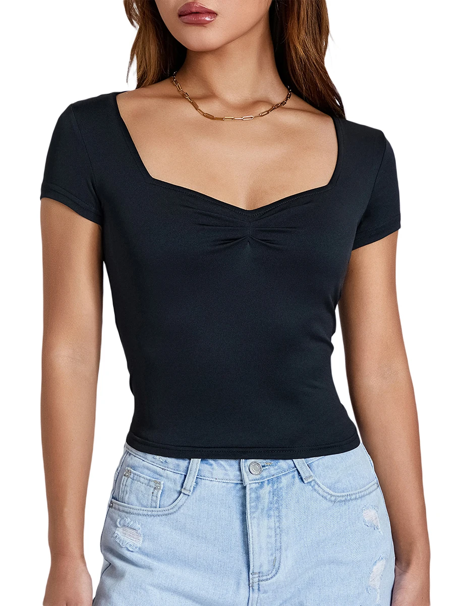 Women T-shirt Low-cut Short Sleeve Pleated Solid Fit Summer Tops for Casual Daily