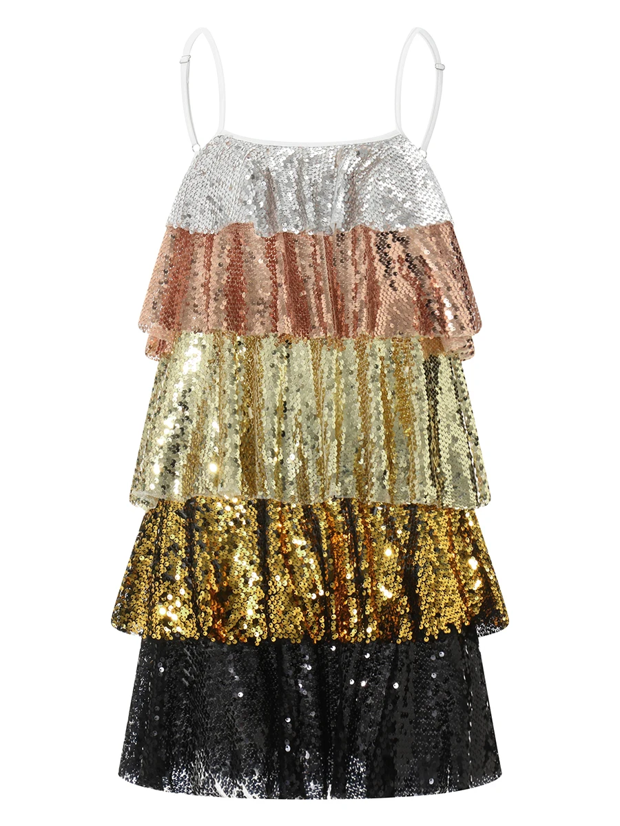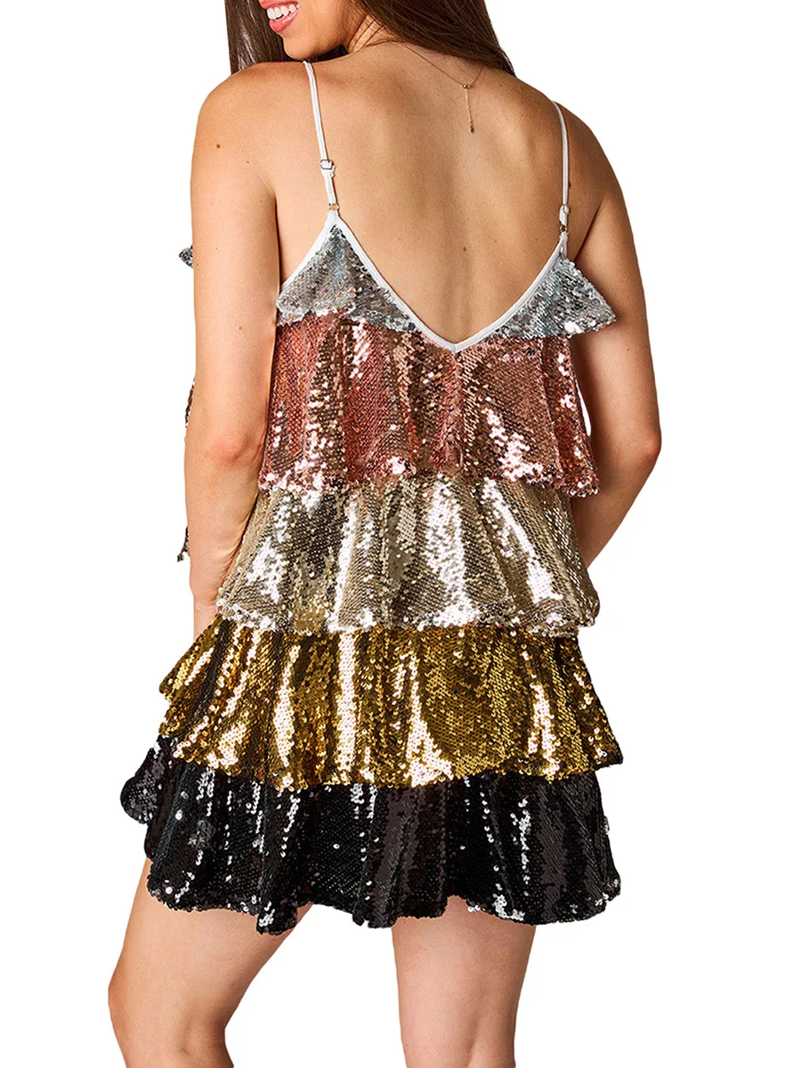 Women’s Summer Short Sling Dress Sleeveless Backless V Neck Layered Ruffle Sequins Dress