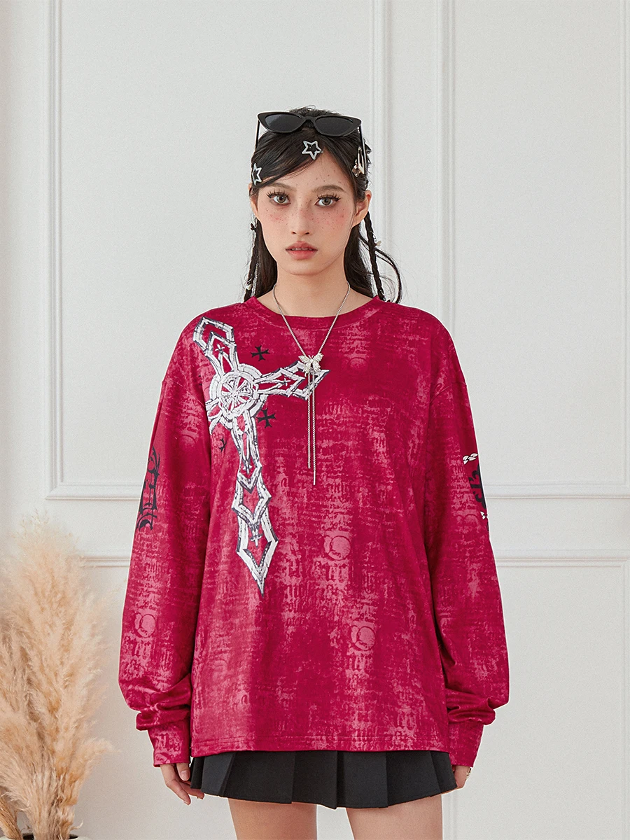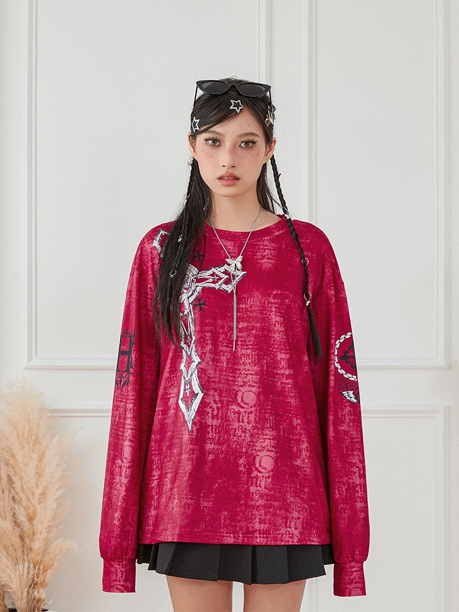 Women’s Vintage Graphic Tops Gothic Long Sleeve Round Neck Loose T-Shirts Streetwear Grunge Tops